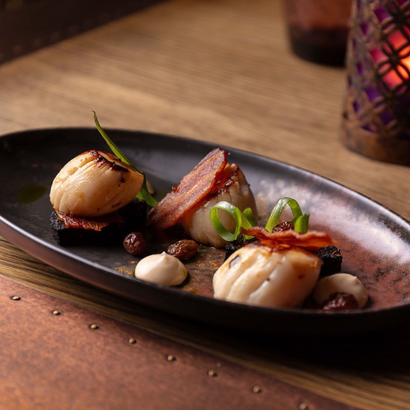 Pan seared king scallops, Stornaway black pudding, velvety celeriac puree, smoked bacon crisp and whisky soaked raisins.